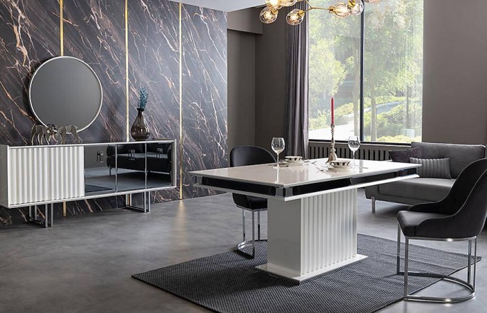 Aymira Beyaz Yemek Odası İndirimli Mobilya Aymira Beyaz Yemek Odası - İzmir mobilya- Aymira Yemek Odası; Konsol ve aynası - açılır yemek masası ve 6 adet sandalye takım fiyatına dahildir Takımdan istediğiniz modülü tek olarak sipariş verebilirsiniz -izmi..