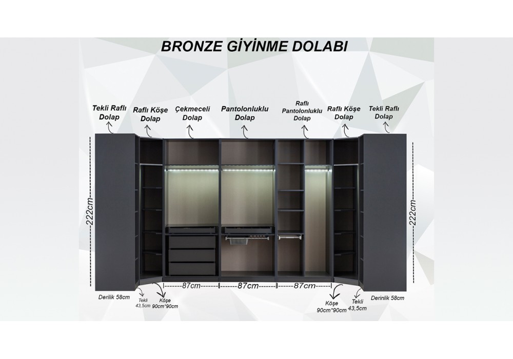 Bronze Antrasit Giyinme Odası Yatak Odası SivrilerMobilya'de yer alan Bronze Antrasit Giyinme Odası koleksiyonumuzu keşfedin. Özel tasarımı ve etkileyici antrasit rengi ile mekânınızı geliştirin. Şimdi alışverişe başlayın ve odanızı şık bir sığınağa dönüştürün.G