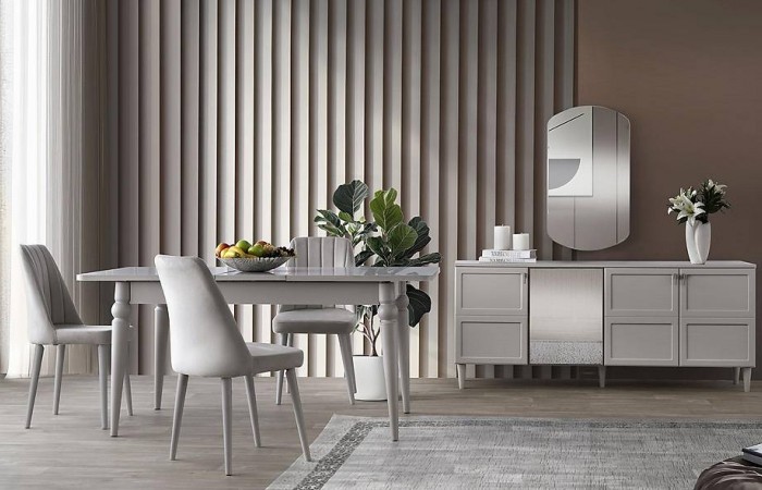 Larina Antrasit Yemek Odası Yemek Odası Larina Yemek Odası; Konsol ve aynası - açılır yemek masası ve 6 adet sandalye takım fiyatına dahildir Takımdan istediğiniz modülü tek olarak sipariş verebilirsiniz. Ölçüler aşağıda belirtilmiştir Paslanmaz..