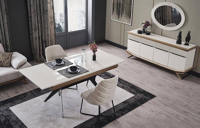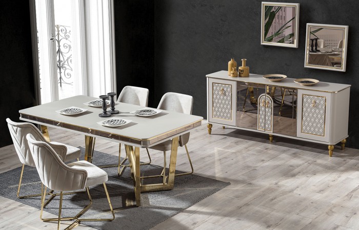 Larina Yemek Odası Yemek Odası Larina Yemek Odası; Konsol ve aynası - açılır yemek masası ve 6 adet sandalye takım fiyatına dahildir Takımdan istediğiniz modülü tek olarak sipariş verebilirsiniz. Ölçüler aşağıda belirtilmiştir Paslanmaz..