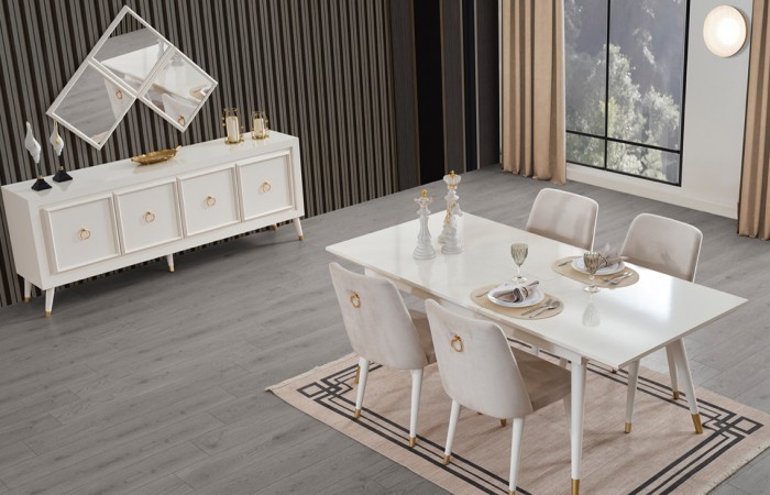 Lenora Yemek Odası - Beyaz Yemek Odası Ürün Ölçüleri Genişlik Yükseklik Derinlik Konsol ve Ayna 200 80 45 Yemek Masası 175 75 95 Açılır Yemek Masası 160*195 75 95..