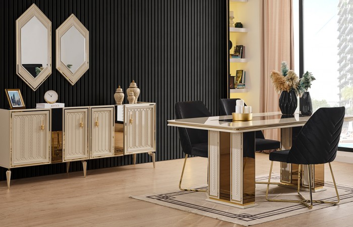Vital Lüks Yemek Odası Yemek Odası Vital Yemek Odası; Konsol ve aynası - yemek masası ve 6 adet sandalye takım fiyatına dahildir Takımdan istediğiniz modülü tek olarak sipariş verebilirsiniz. Ölçüler aşağıda belirtilmiştir Lükens ayak yapıs..